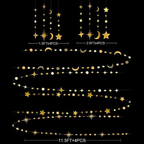 🌟PACKAGE CONTAINS- 4 strings of matellic gold star and moon circle dot garlands (in 4 styles), 8 set of large hanging gold star and moon circle dot cutouts(in 4 styles), the total length is 64 feet.