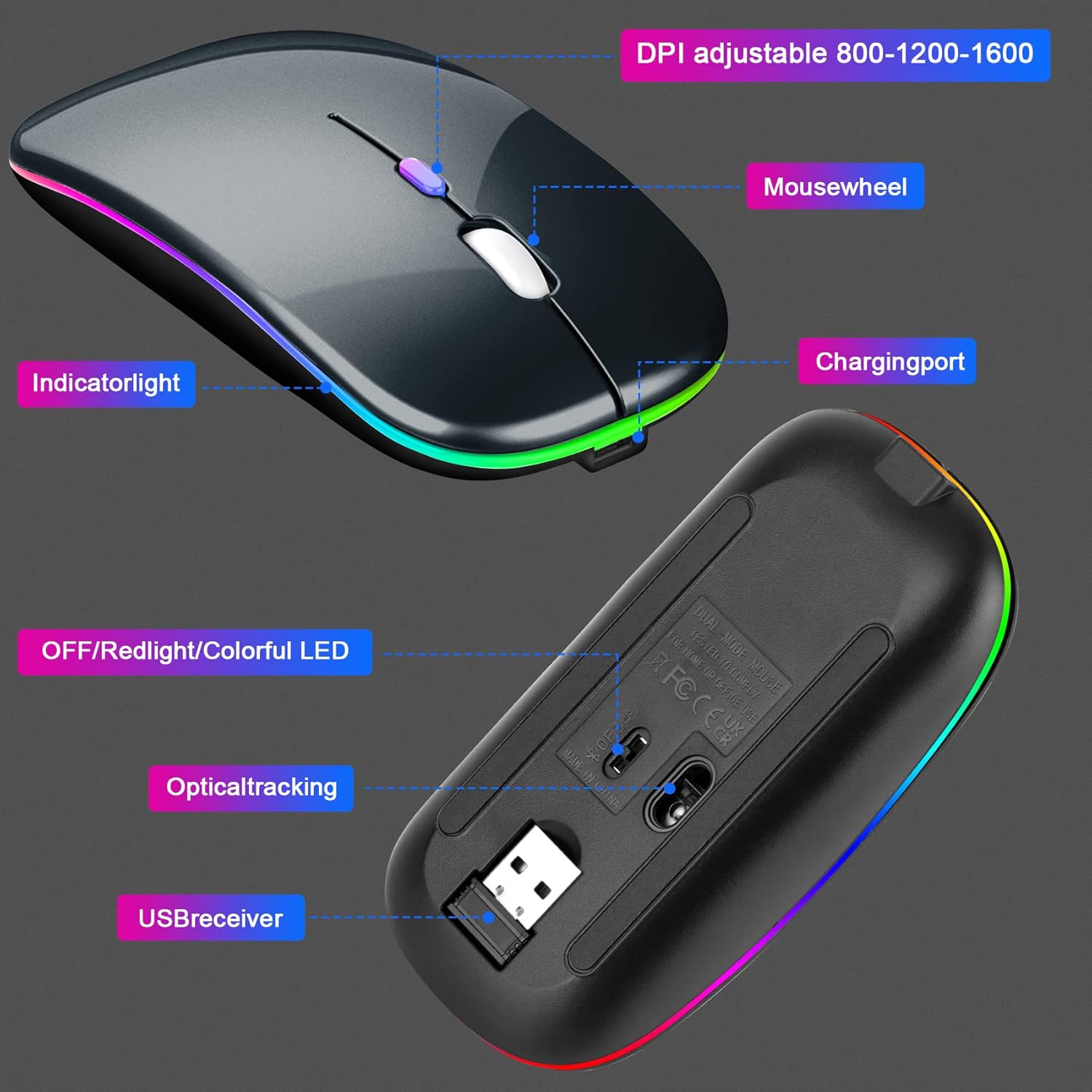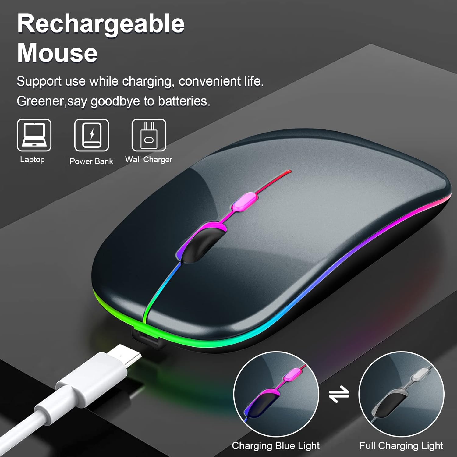 【Rechargeable Optical Mouse】Built-in durable rechargeable battery, that can be easily charged using the included USB cable without replacing the battery. You can use the mouse when charging. Standby time is very long; turn off the mouse LED light when not in use to save power. Note: If your laptop has a type-c port, you need to connect the supplied USB-C to the USB adapter and plug the USB receiver into it.